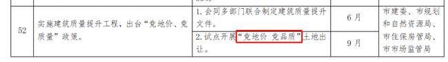 3月24日,杭州市政府官网发布了《2021年省政府工作报告重点工作涉杭任务和市政府工作报告重点工作责任分解》,其中就提到了“竞地价、竞质量”的政策。文件指出,6月底前,会同多部门联合制定建筑质量提升文件。9月底前,试点开展“竞地价 竞质量”土地出让。