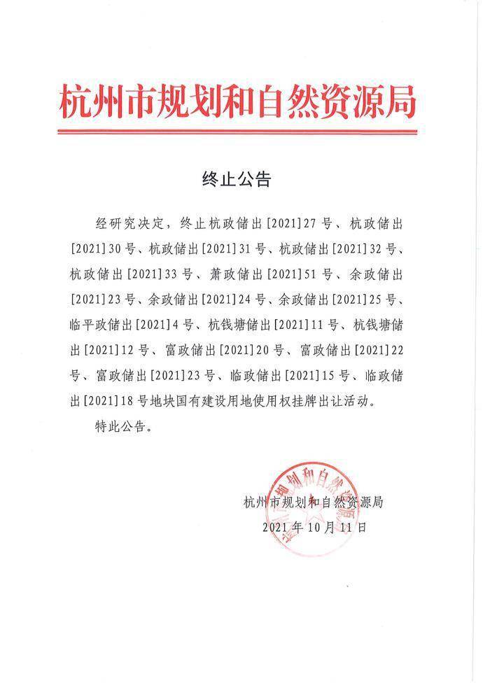《终止公告》称,经研究决定,终止杭政储出[2021]27号、杭政储出[2021]30号、杭政储出[2021]31号、杭政储出[2021]32号、杭政储出[2021]33号、萧政储出[2021]51号、余政储出[2021]23号、余政储出[2021]24号、余政储出[2021]25号、临平政储出[2021]4号、杭钱塘储出[2021]11号、杭钱塘储出[2021]12号、富政储出[2021]20号、富政储出[2021]22号、富政储出[2021]23号、临政储出[2021]15号、临政储出[2021]18号地块国有建设用地使用权挂牌出让活动。